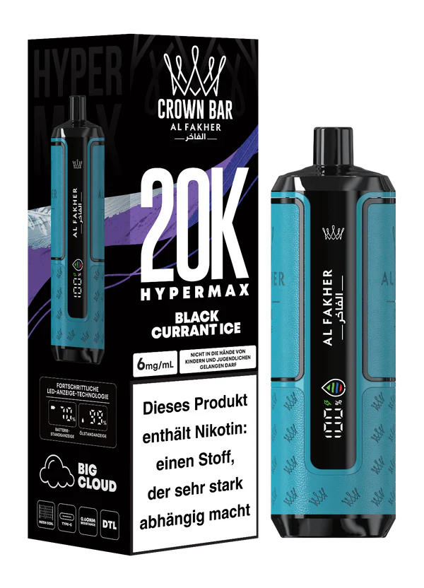 The Hypermax 20K is a powerful Big Puff disposable vape that delivers up to 20,000 puffs thanks to optimized airflow management – without losing intensity. Inside, it features a three-stage liquid system with a 2ml active tank and two 10ml refill chambers that activate automatically. Operation is fully draw-activated – no buttons, no settings. The built-in LED display keeps you informed about battery, liquid, and puff count at all times. It’s powered by a high-performance cell that is non-rechargeable – maximum comfort meets maximum output.